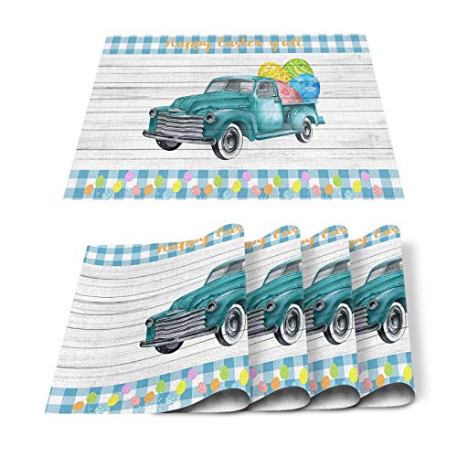 Consumer Reviews Easter Truck Placemats Set of 6,Farm Blue Car with Colorful Eggs Placemat for Dining Table Decorations, Heat-Resistant Washable Table Mats for Kitchen Dinner Banquet Wooden Board and Buffalo Checker